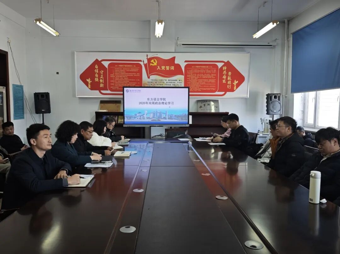 按照学校党委整体部署,东方语言学院于2026年3月11日13:30在综合楼1008室开展2026年第一次双周政治理论学习。东方语言学院领导班子和全体教工参加本次会议,会议由学院党委书记周英会主持。