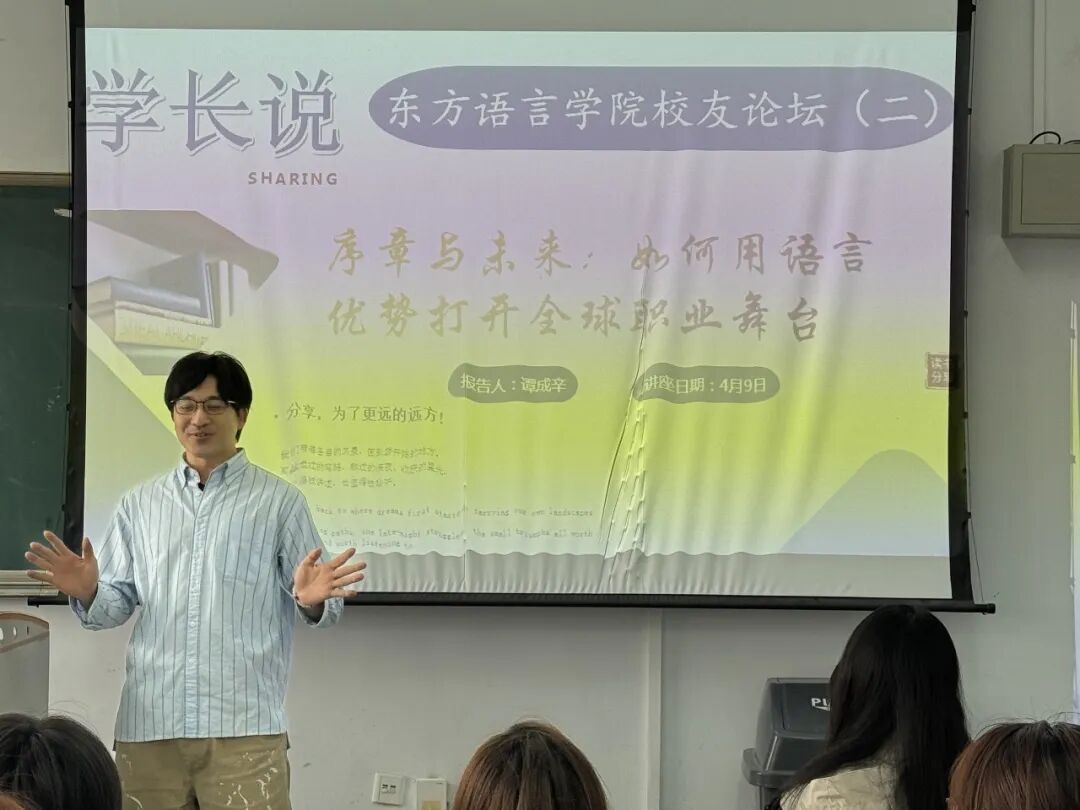 4月9日,我院“学长说”校友论坛第二讲于综合楼621教室举行。讲座由院长房国铮主持,主讲人为2016届日语专业毕业生、现任日本埃森哲公司IT部门项目经理谭成辛,他以“序章与未来,如何用语言优势打开全球职业舞台”为题,为校友与学子带来前沿职业发展分享。