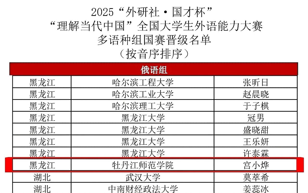 近日,2025“外研社·国才杯”“理解当代中国”全国大学生外语能力大赛省级复赛圆满落幕。东方语言学院俄语专业2022级学生宫小烨凭借扎实的语言功底、出色的综合素养,在多语种组激烈角逐中脱颖而出,成功斩获省赛金牌,获得国赛的晋级资格,将代表学校征战全国总决赛!