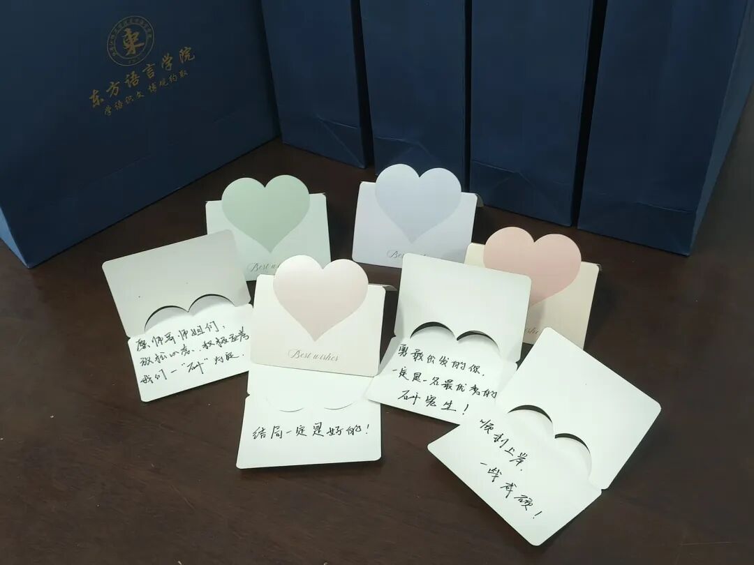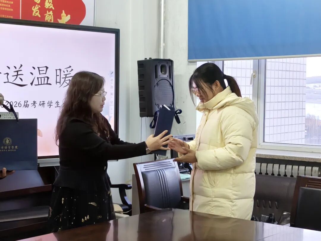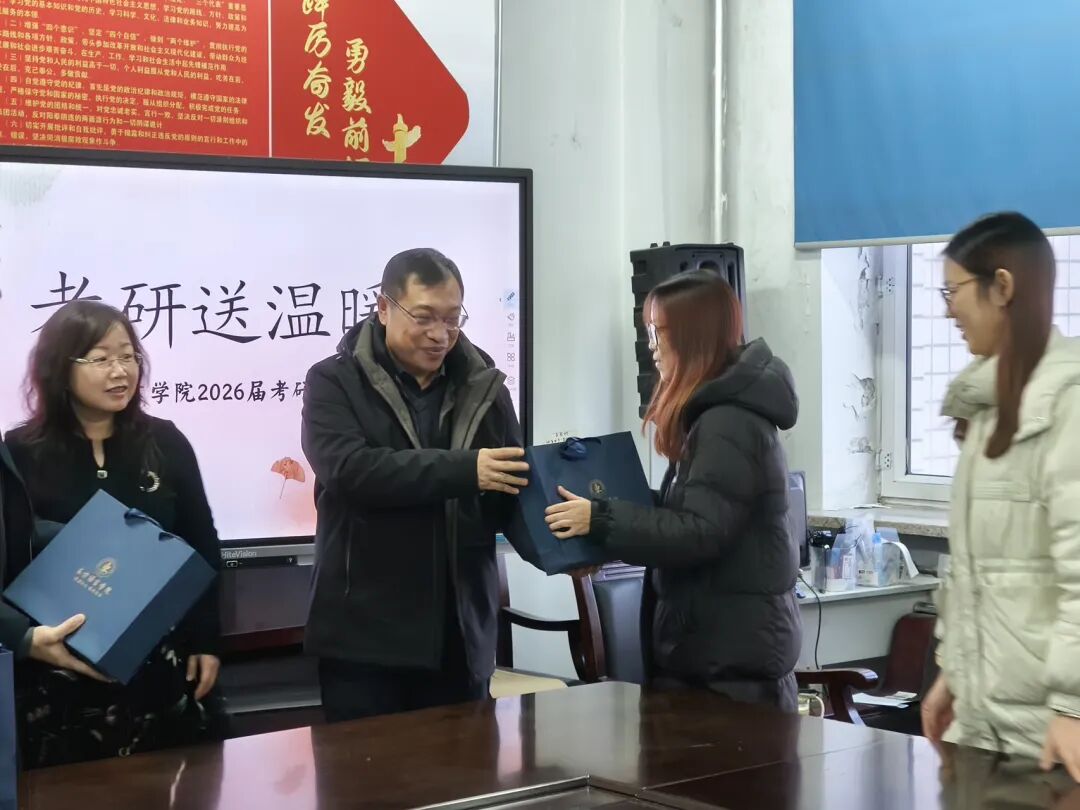 活动最后,领导、老师们为考研学子送上我院精心准备的“暖心加油包”。礼包中每一份礼物都代表了一份期待,包含学院专属定制的笔记本、水杯,学弟学妹亲手书写的“上岸”贺卡。这些礼物不仅是实用的礼品与美好的祝愿,更是学院对每位考研学子倾注的关怀与鼓励,让考研学子们在备考的路上多一份来自学院的安心与力量。