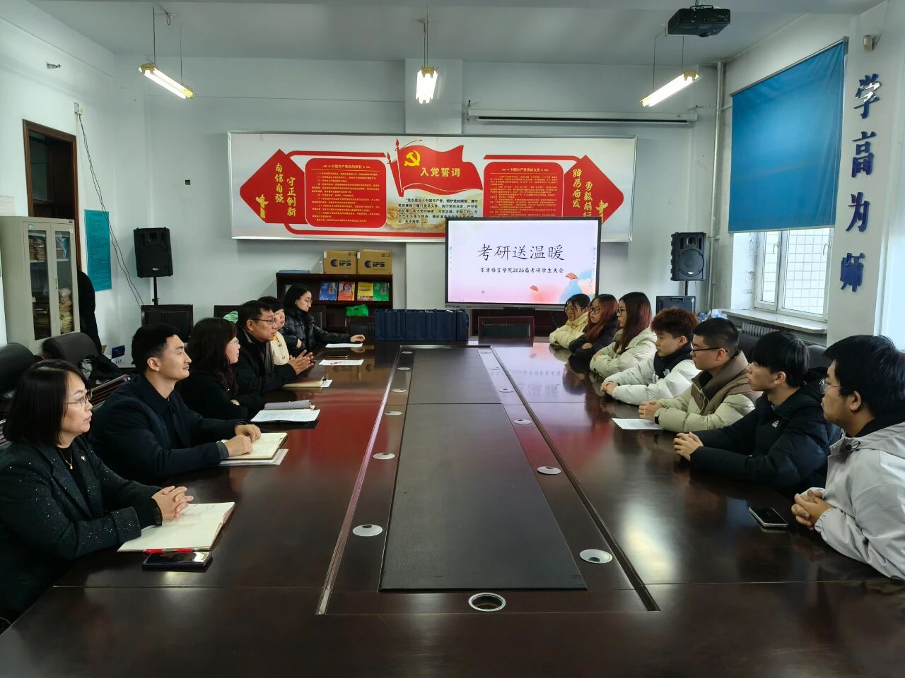 2026年硕士研究生招生考试进入倒计时,为缓解考研学子学习压力,帮助学生树立信心,东方语言学院于2025年12月3日在综合楼1008室举办考研送温暖活动。东方语言学院党委书记周英会、院长房国铮、党委副书记张秋实、副院长刘凯东、副院长董奎玲、辅导员郝欣欣参加此次活动。