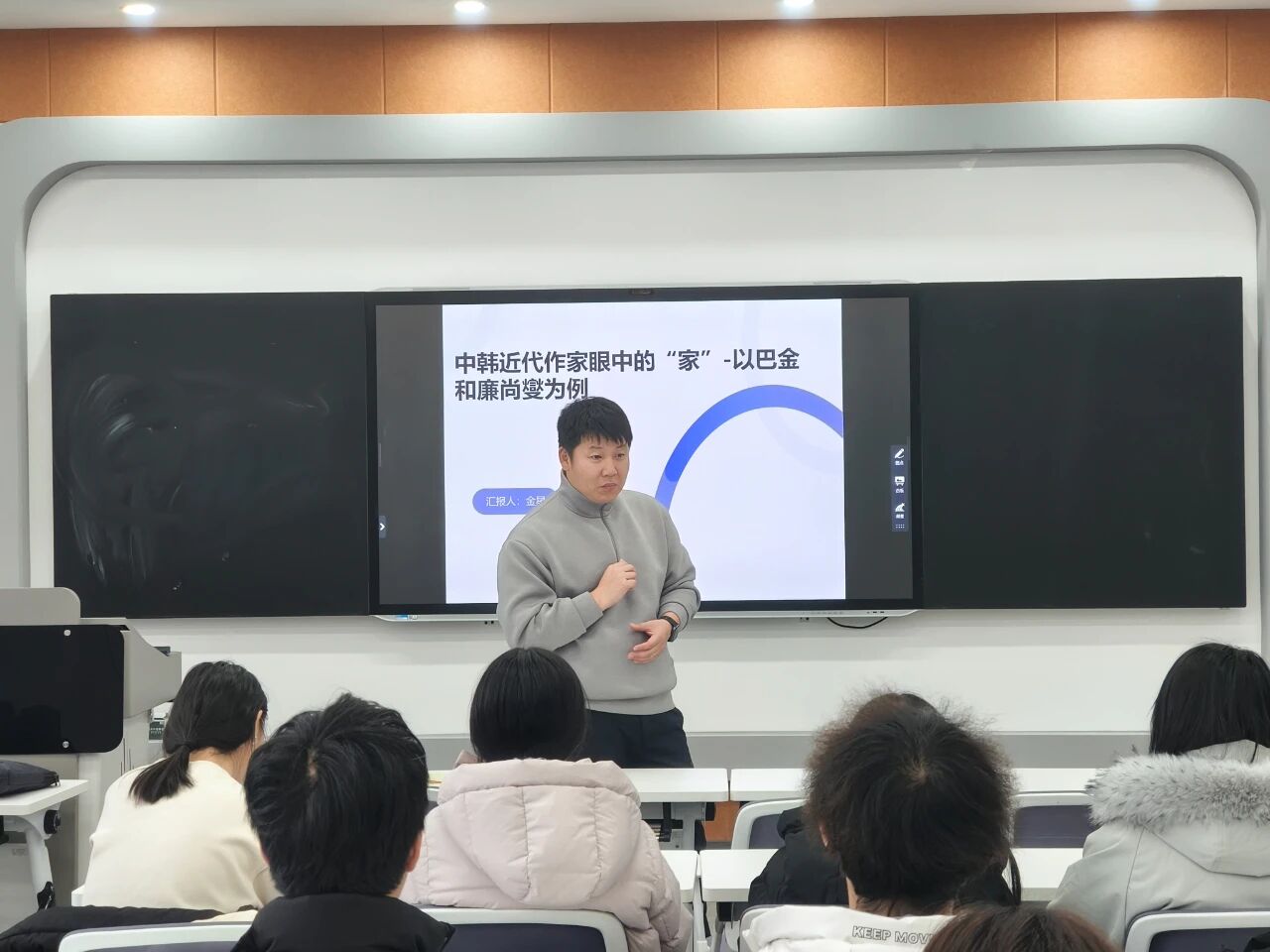 讲座中,金老师不仅系统梳理了韩语就业的多元发展方向,更引导我们重新审视“家”在当下的意义——它早已超越物理空间的局限,成为一种深刻的情感与精神存在。于学子而言,家是疲惫时可以停靠的港湾,是求学路上默默支撑我们的精神力量;父母的叮咛、家人的牵挂,汇聚成抵御学业压力的温暖底色。而在快节奏的现代社会中,“家”更成为人们追寻归属感的精神坐标。面对职场竞争与生活奔忙,越来越多的人开始珍视家庭中那份无可替代的温暖。如今的“家”,不再是旧式礼教的载体,而逐渐演变为一个以平等、尊重与相互扶持为内核的情感共同体。