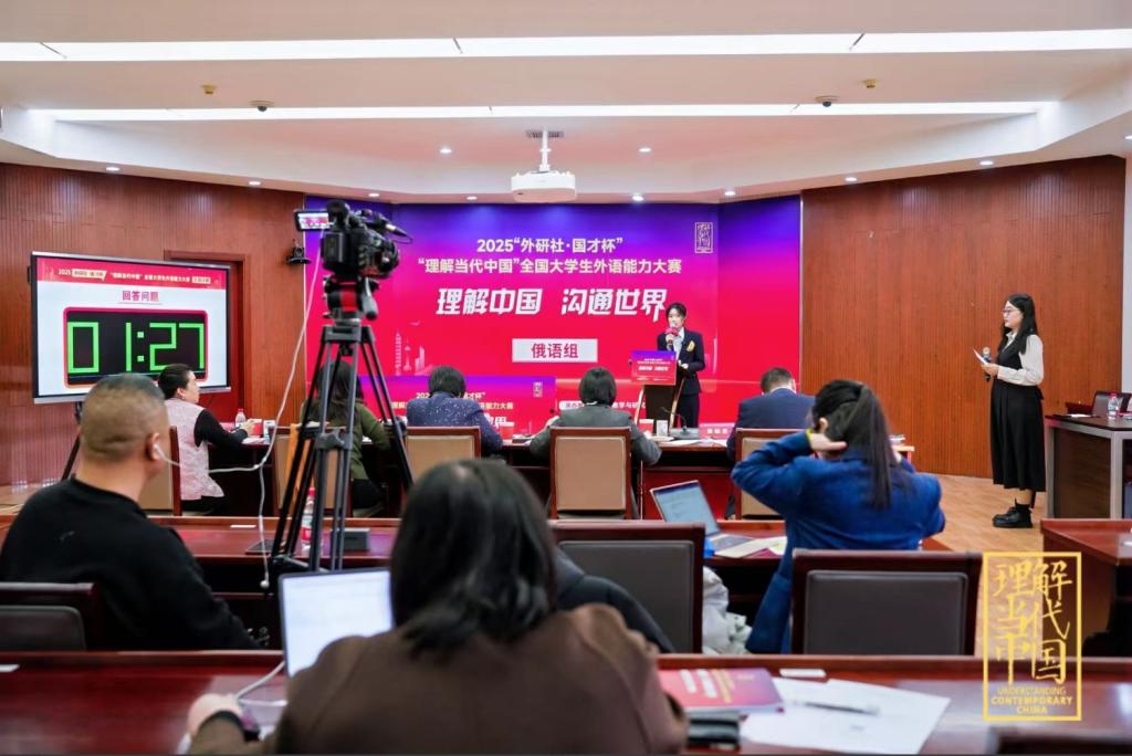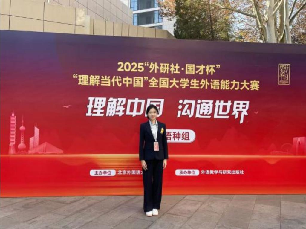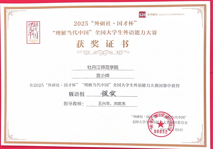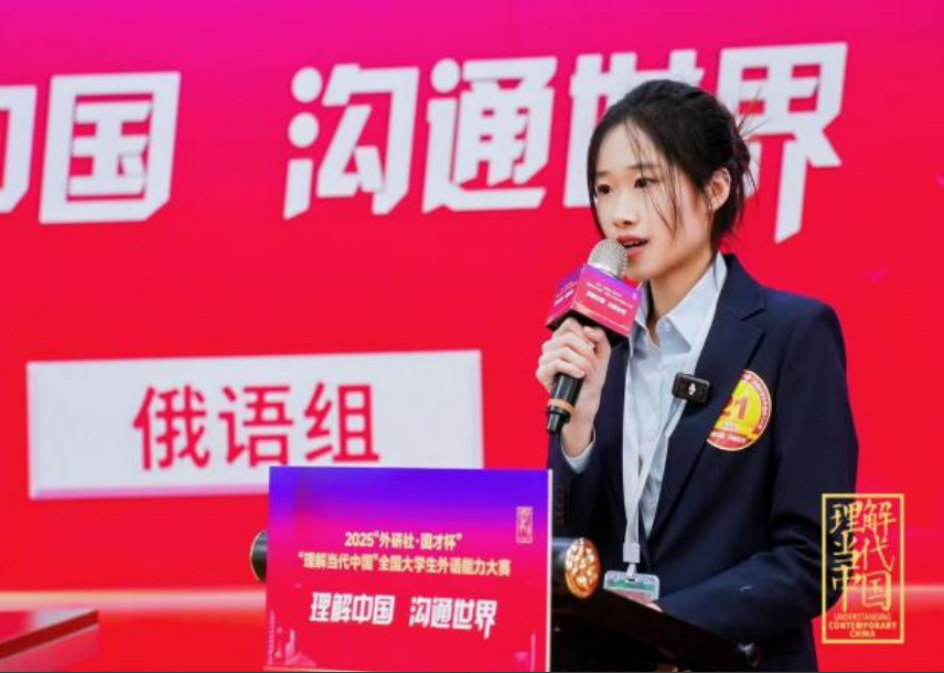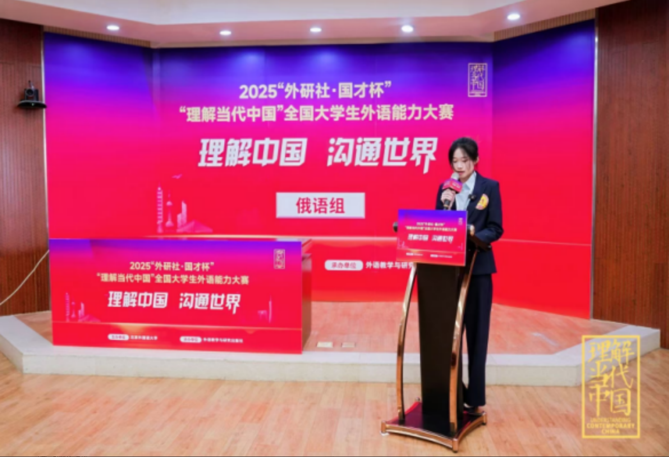 12月8日,2025“外研社·国才杯”“理解当代中国”全国大学生外语能力大赛(多语种组)全国总决赛于北京圆满落幕。本届大赛以“理解中国,沟通世界”为主题,由北京外国语大学主办、外语教学与研究出版社承办,受到教育行政部门、高校教育专家及实务部门专家等各界人士的高度关注与认可。我校俄语专业2022级学生宫小烨凭借扎实的专业功底与出色的临场发挥,代表学校参赛并斩获国赛银奖。